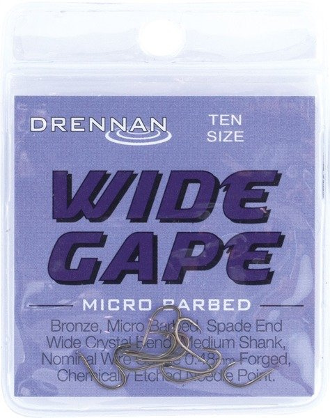 DRENNAN Wide Gape to brązowy mocny haczyk na duże ryby. Posiada mikrozadzior, średniej długości trzonek, kuty drut od 0,36 do 0,56 mm oraz chemicznie ostrzony grot.