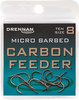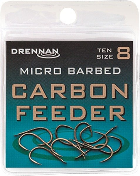 DRENNAN Carbon Feeder to mocny haczyk, idealny do wszystkich metod łowienia z kołowrotkiem. Brązowy kolor, mikrozadzior, okrągłe kolanko, krótki trzonek, grubość drutu od 0,36 do 0,64 mm, chemicznie ostrzony grot.