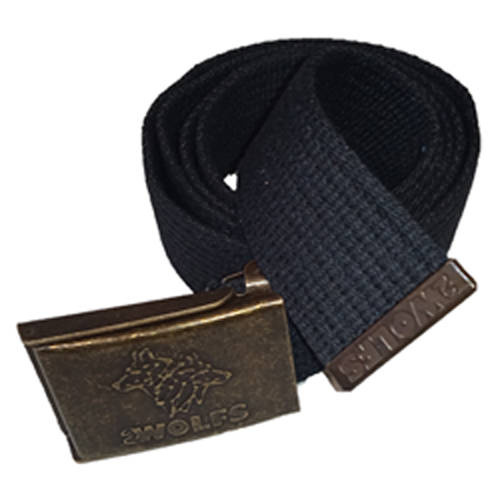 Klasyczny parciany pasek do spodni z metalową klamrą.