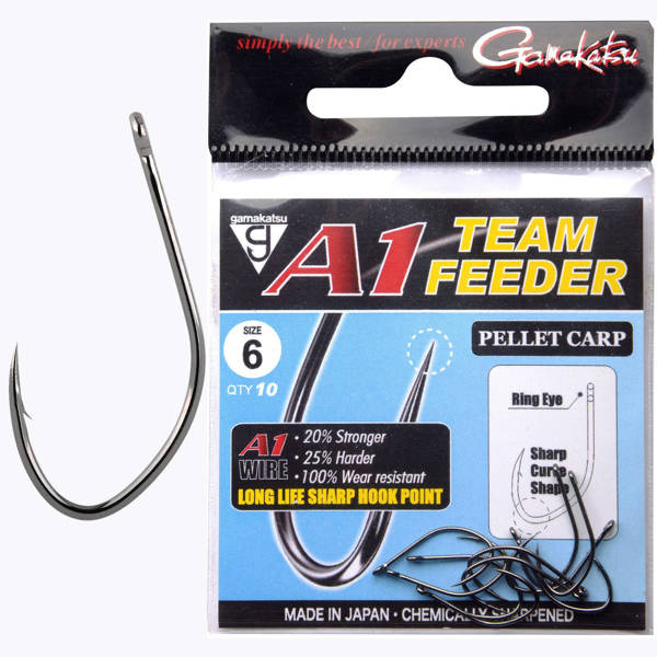 Haczyki Gamakatsu A1 Team Feeder PELLET CARP to linia zawodniczych japońskich haków z wykonanych z mocniejszego kutego drutu. Haki zapewniają pewność holu oraz utrzymania nawet większych ryb karpiowatych. Wykorzystany materiał jest o 20% mocniejszy niż wykorzystywany w standardowej serii haków, a do tego 25% mniej podatny na odkształcenia. Świetnie wyprowadzone ostrze i grot haka pozwala na pewne zacięcie nawet podczas połowu karpi.