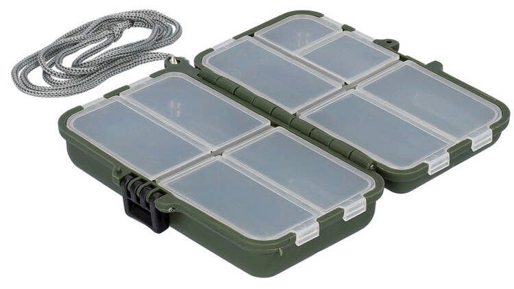 Pudełko posiada mocne zamknięcie zabezpieczające przez przypadkowym otwarciem i zgubieniu zawartości w nurcie rzeki. Całość podzielona na 9 osobno zamykanych przegród (1 -2,7x2,7cm, 1- 2,1x2,7cm i 7 -5,2x2,7cm)