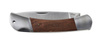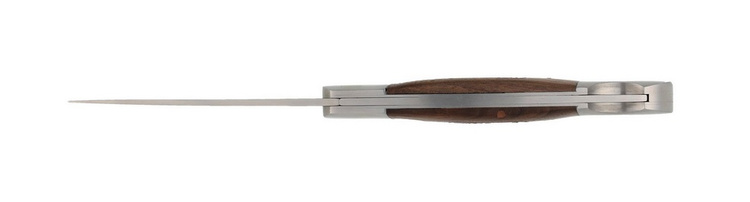 - Wygodna rękojeść: Tradycyjna rękojeść wykonana z drewna orzecha włoskiego, połączona z polerowanymi stalowymi okuciami, co nadaje nożowi elegancki wygląd. Rękojeść jest ergonomiczna i zapewnia pewny chwyt. Dodatkowo, w tylnej części rękojeści znajduje się otwór do wplecenia rzemienia lub paracordu.