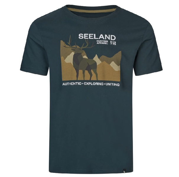 Koszulka posiada klasyczny okrągły dekolt, regularny krój i charakterystyczny nadruk na piersi, który odzwierciedla zaangażowanie marki Seeland w promowanie stylu życia myśliwych.