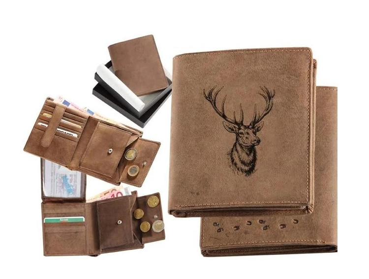 • Portfel skórzany Jeleń byk - brązowy, kompaktowy (13×10 cm), z tłoczeniem jelenia byka. Idealny dla myśliwych. Zapakowany w eleganckie pudełko.