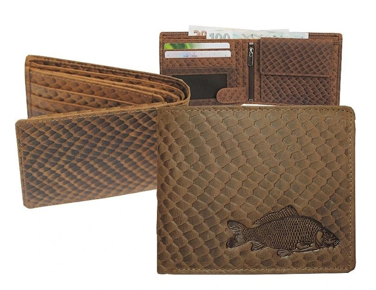 • Portfel skórzany Karp - brązowy, kompaktowy (13×10 cm), z tłoczeniem łuski karpia oraz wizerunkiem Karpia. Idealny prezent dla wędkarza. Zapakowany w eleganckie pudełko.