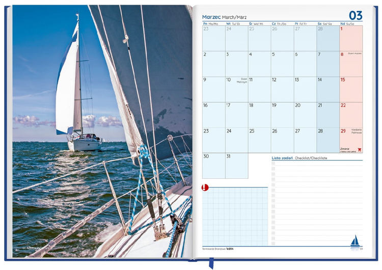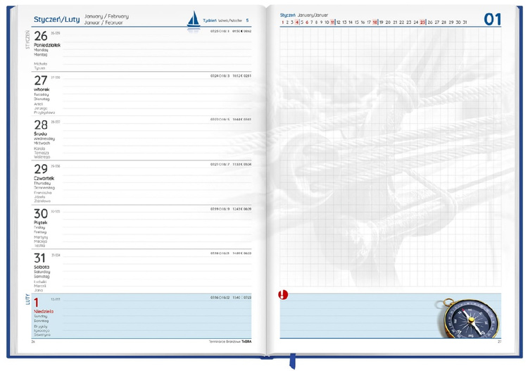 Układ kalendarium - Tydzień na jednej rozkładówce, obok przestrzeń na własne notatki i zapiski - umożliwia wygodne planowanie rejsów, szkoleń i zapisów ważnych wydarzeń.