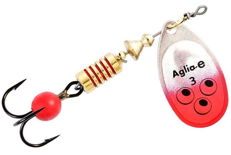 Aglia -E ( e od eggs) łączy w sobie sprawdzoną przez miliony wędkarzy srebrną błystkę Aglię z wyglądem jajeczek IKRY, czyli ulubionego przysmaku pstrągów, łososi, troci i okoni.