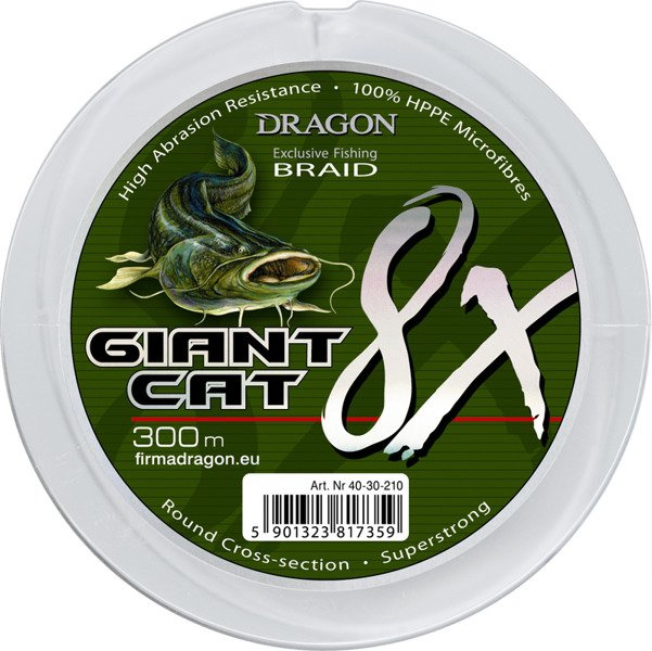 Giant Cat to specjalistyczna plecionka do połowu sumów. Dzięki zastosowaniu techniki ośmiosplotowej, plecionka Giant Cat 8X jest wyjątkowo mocna i w pełni okrągła w przekroju a jednocześnie elastyczna i pozbawiona pamięci kształtu.
